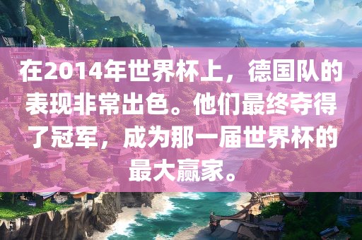 在2014年世界杯上,德国队的表现非常出色。他们最终夺得了冠军,成为那一届世界杯的最大赢家。
