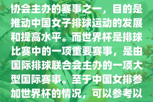 中国女子排球联赛是中国排球协会主办的赛事之一,目的是推动中国女子排球运动的发展和提高水平。而世界杯是排球比赛中的一项重要赛事,是由国际排球联合会主办的一项大型国际赛事。至于中国女排参加世界杯的情况,可以参考以下信息