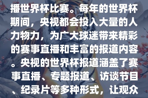 央视作为世界杯赛事的重要转播媒体,每年世界杯期间都会投入大量资源,为广大球迷带来精彩的赛事直播和丰富的报道。报道形式包括赛事直播、专题报道、访谈节目和纪录片等,让观众全面了解世界杯背后的故事和瞬间。